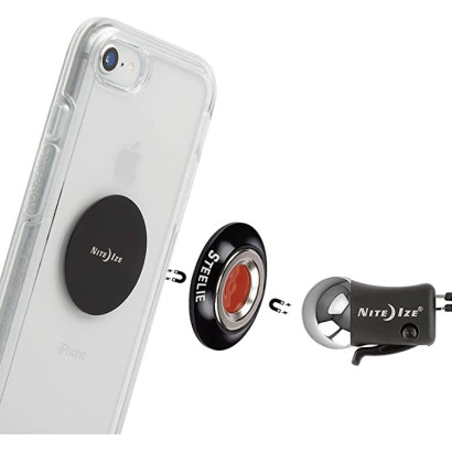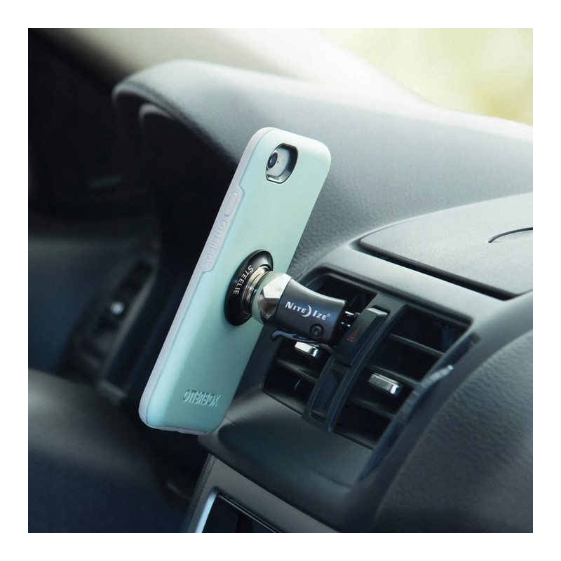 Zestaw montażowy Steelie Orbiter Vent Mount Kit przenosi na wyższy poziom, łącząc nasz przenośny uchwyt wentylacyjny, mocne gniazdo magnetyczne Orbiter i niskoprofilową metalową płytkę, którą można łatwo przymocować do telefonu lub etui. Uchwyt wentylacyjny można przenosić z samochodu do samochodu, po prostu odblokowując mocną dźwignię krzywki, a następnie blokując ją z powrotem na następnym odpowietrzniku pojazdu. Gniazdo magnetyczne Orbiter mocuje się do uchwytu wentylacyjnego za pomocą silnego magnesu neodymowego i silikonowego środka, zapewniając bezpieczne połączenie i płynny poślizg. Powierzchnia montażowa gniazda magnetycznego Orbiter jest wyposażona w cienki pierścień o wysokim współczynniku tarcia, który zapobiega ślizganiu się i zapewnia, że telefon pozostaje bezpiecznie na swoim miejscu. Po prostu przyklej niskoprofilową metalową płytkę do telefonu lub etui, przymocuj uchwyt wentylacyjny do otworu wentylacyjnego pojazdu i już możesz szybko podłączać, odłączać i obracać telefon, aby uzyskać idealny kąt widzenia.