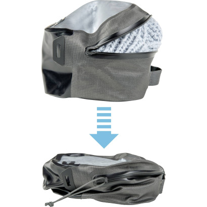 Bezzębny, zamek błyskawiczny to opatentowane rozwiązanie TRU® Zip. Torba posiada klasę wodoszczelności IP67, może być zanurzona w wodzie na głębokość 1 m do nawet 30 minut. Jej wymiary wewnętrzne wynoszą 126 x 175 x 81 mm. Na przedniej ścianie posiada przeźroczyste okienko, dzięki czemu łatwo odnajdziesz każdy zabezpieczony przed wodą przedmiot. Do bocznych uchwytów można przyczepić karabińczyk i całość dopiąć np. do plecaka. Na górze torby znajduje się nylonowy uchwyt transportowy.